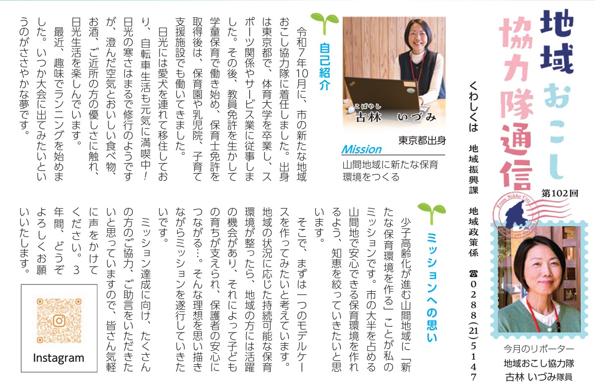広報にっこう令和8年2月号の「地域おこし協力隊通信」で、古林隊員の活動が紹介されています。