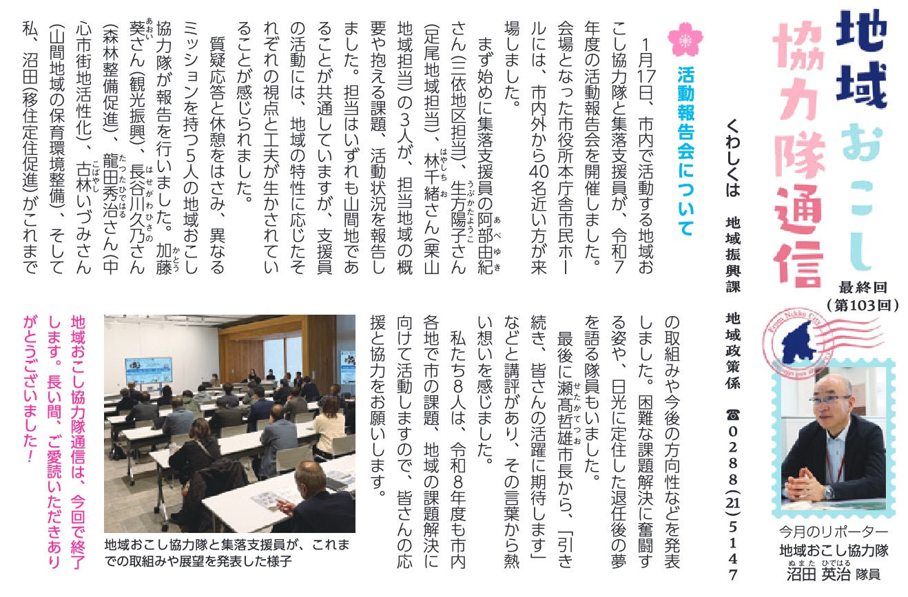 広報にっこう令和8年4月号の「地域おこし協力隊通信」(第103回・最終回)で、1月17日に行われた活動報告会の様子が紹介されています。