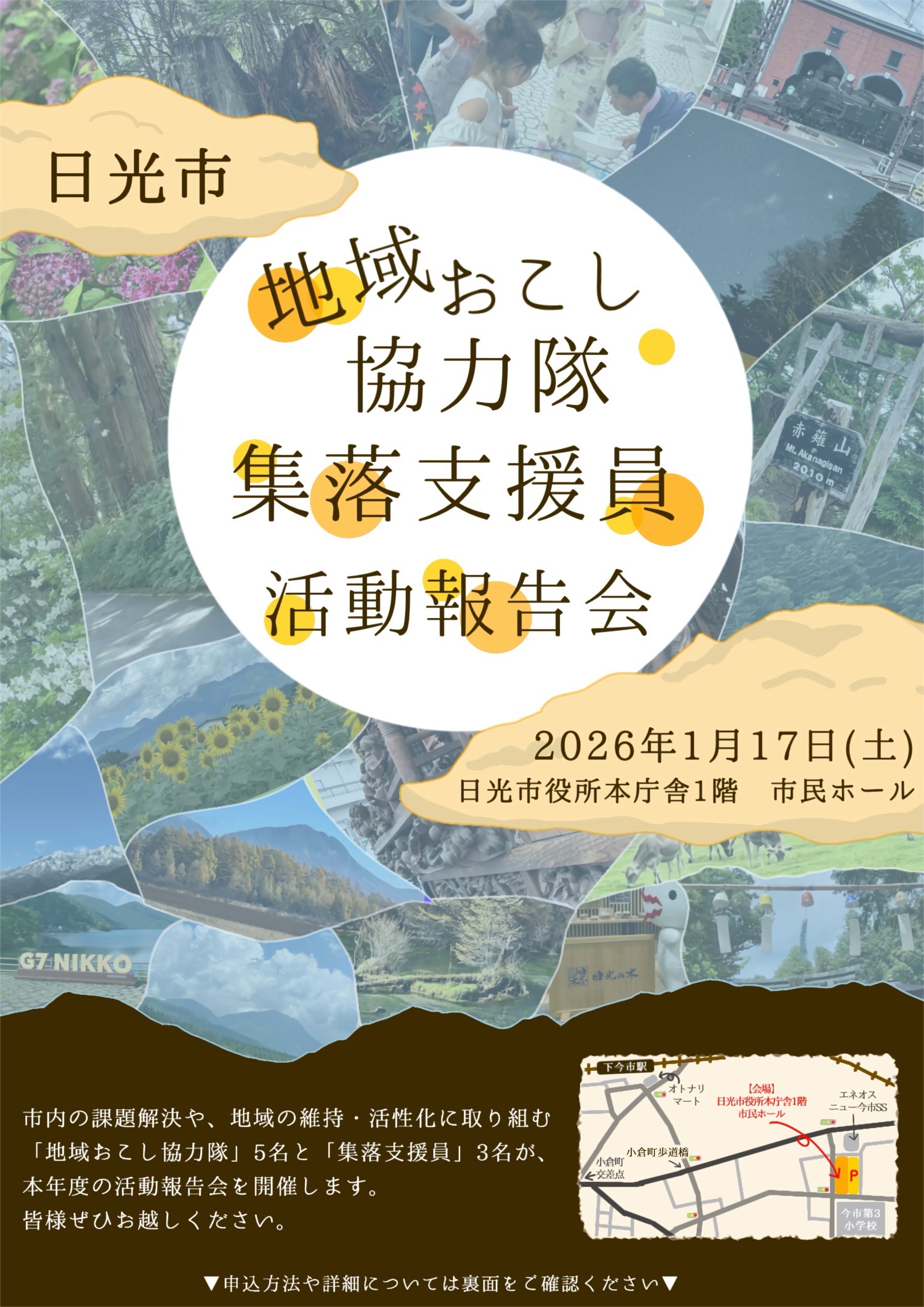 市内の課題解決や、地域の維持・活性化に取り組む「地域おこし協力隊」5名と「集落支援員」3名が、本年度の活動報告会を開催します。 皆様ぜひお越しください。